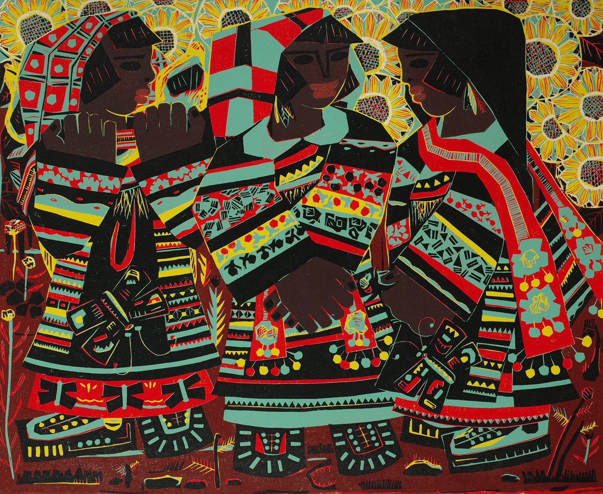 《拉祜风情——染》绝版套色木刻70×57cm郑旭1984年