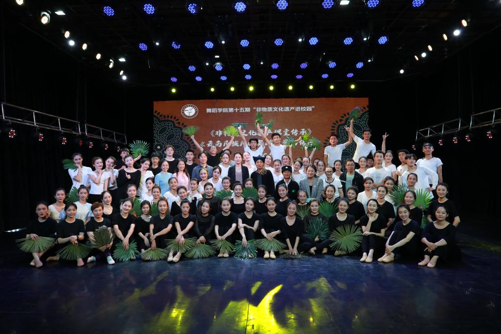 在庆祝中国共产党成立100周年之际,为深入推进云南非物质文化遗产保护,传承少数民族生生不息的传统文化,继而大力推动云南非物质文化遗产——传统民间舞蹈在高校的传承、传播及可持续发展,使非遗传承进校园呈常态化,舞蹈学院于2021年7月7日14::00时在舞蹈学院四楼小剧场举办第十五期“非遗进校园”活动。此次活动邀请到非物质文化遗产代表性项目传统舞蹈哈尼族“棕扇舞”市级传承人倪为者、县级传承人黄沙福老师到校进行为期一周的现场授课,以促进舞蹈学院民族艺术保护研究与实践专业人才的培养。此次教学汇报由舞蹈学系主任朱维青教授主持,舞蹈学院党政领导,各系部教师和学生观看汇报。