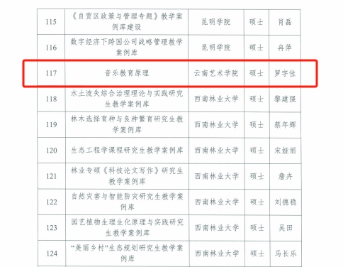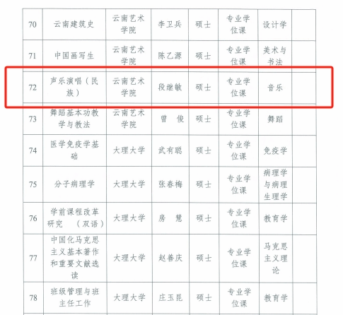 根据《云南省学位委员会云省教育厅关于公布2023年度云南省研究生优质课程建设项目名单的通知》(云学位【2023】7号)《云南省学位委员会 云省教育厅关于公布2023年度云南省专业学位研究生教学案例库建设项目名单的通知》(云学位【2023】9号),云南省立项建设研究生优质课程100门、专业学位研究生案例库建设144个。经层层征集、评审推荐和公示,省学位委员会办公室审核和公示等程序,今年会官方网站音乐学院获批1个省级研究生优质课程,1个省级专业学位研究生案例库建设项目。具体项目名单如下:
