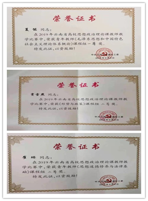 近年来,马院着力抓好师资队伍建设,扎实推进教学质量稳步提升,注重通过教学比赛锻造教师队伍,支持和鼓励广大中青年教师参加各级各类教学比赛,在国内各级各类教学比赛中取得了一系列优异成绩:我校马院教师连续两年代表云南省参加“粤桂琼赣滇”五省(区)高校思想政治理论课青年教师教学基本功比赛,2018年牛宇老师荣获“二等奖”、2019年夏能老师荣获“二等奖”。在2019年云南省高校思想政治理论课教师教学比赛中,我校马院教师夏能荣获“一等奖”,崔琳、贾雪燕获得“二等奖”。在云南省第二届思想政治理论课教师教学技能大赛中,我校马院教师和媛燕、李盖启均荣获“二等奖”。
