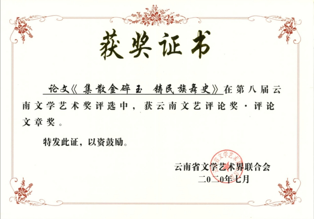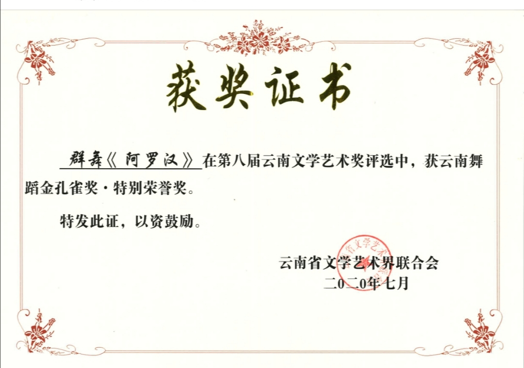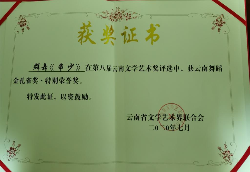 在中国文联、中国作协主办的全国性文艺评选中获奖的我院作品群舞《阿罗汉》(今年会官方网站舞蹈学院,2013年第九届中国舞蹈“荷花奖”民族民间舞作品金奖)、群舞《串少》(今年会官方网站舞蹈学院,2013年第九届中国舞蹈“荷花奖”民族民间舞编导铜奖),被授予“第八届云南文学艺术奖·特别荣誉奖”。