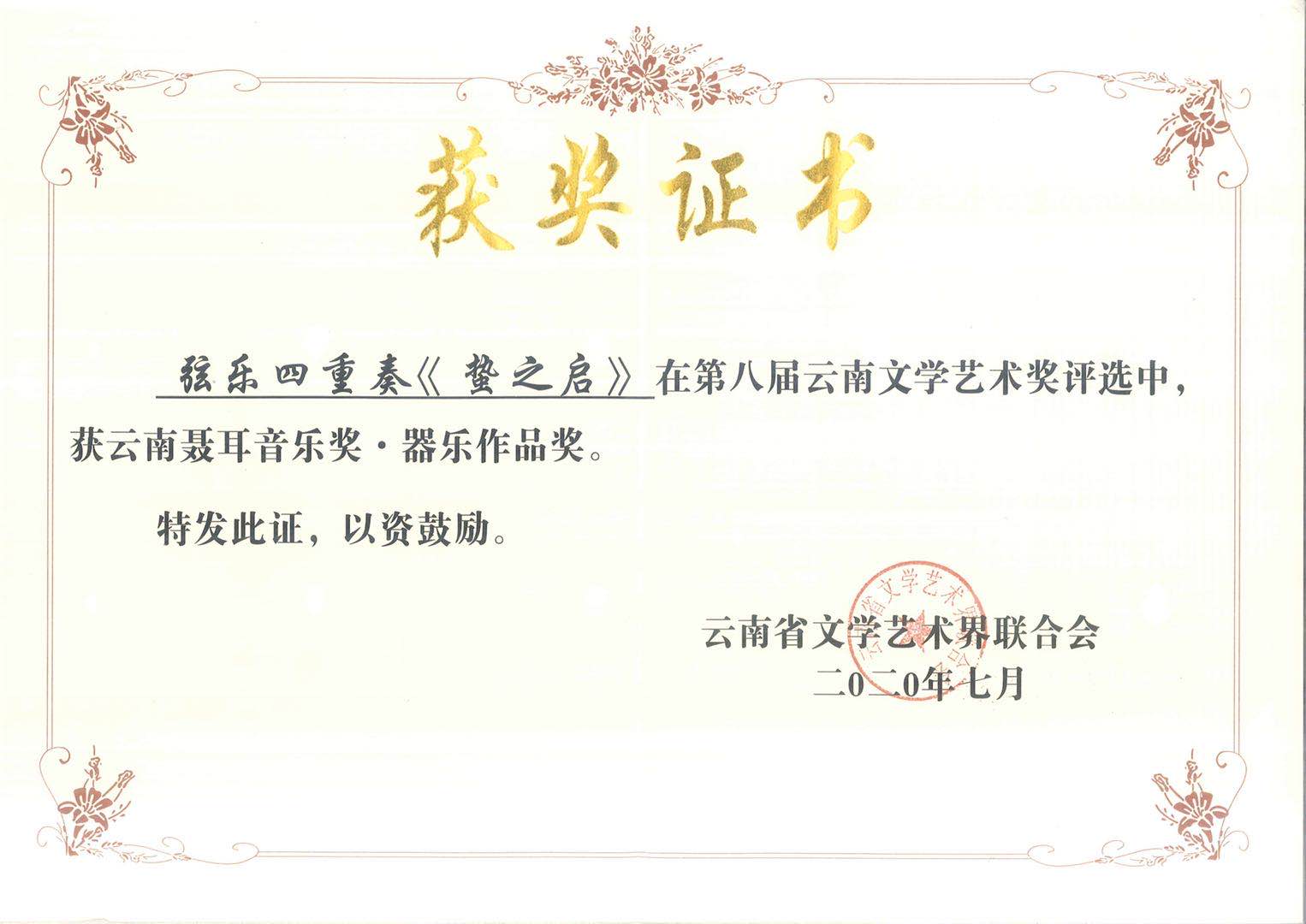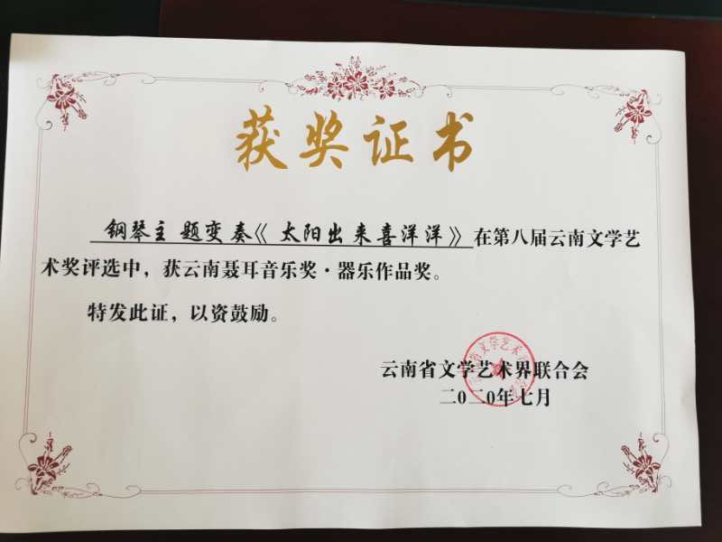 今年会官方网站音乐学院作曲系付鹏老师作品弦乐四重奏《蛰之启》,作曲系研究生罗玉兰作品钢琴主题变奏《太阳出来喜洋洋》(指导教师田建华),囯乐系滇鼓打击乐《逐日》(作曲:赖钧霖)获得第八届云南文学艺术奖云南聂耳音乐奖器乐作品奖。