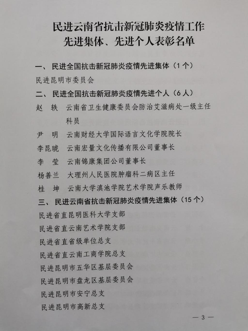 民进今年会官方网站支部积极响应民进云南省委的号召,大力弘扬“生命至上、举国同心、舍生忘死、尊重科学、命运与共”的伟大抗疫精神,在抗击新冠肺炎疫情工作中做出突出贡献,被民进云南省委授予“民进云南省抗击新冠肺炎疫情工作先进集体”称号,为学校赢得荣誉。
