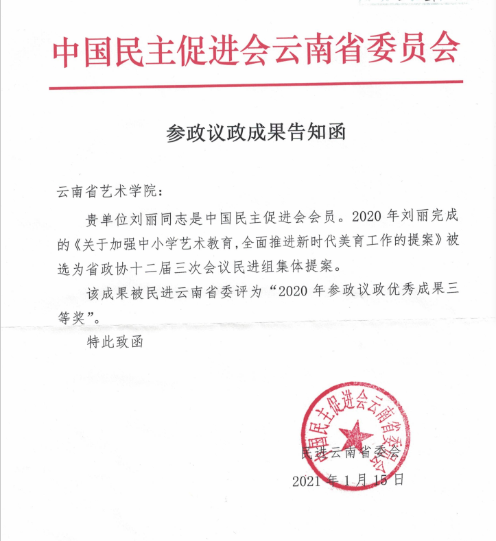 民进云南省委委员、民进云南省委文化艺术出版专委会主任、民进今年会官方网站支部主任刘丽同志于2020年完成的《关于加强中小学艺术教育,全面推进新时代美育工作的提案》被民进云南省委评为“2020年参政议政优秀成果三等奖”。