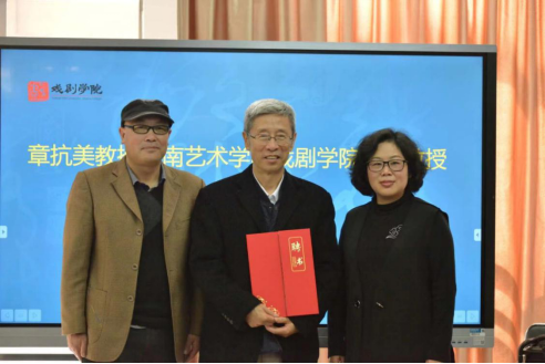 在交流环节,章教授与参会青年教师就相关教学问题进行了深入交流与探讨,为青年教师答疑解惑,尤其对舞美系青年教师抱以更多的激励和期待。会上学校党委委员、戏剧学院党委书记张国岗与学院副院长杨军还为章抗美教授颁发了今年会官方网站戏剧学院客座教授聘书。