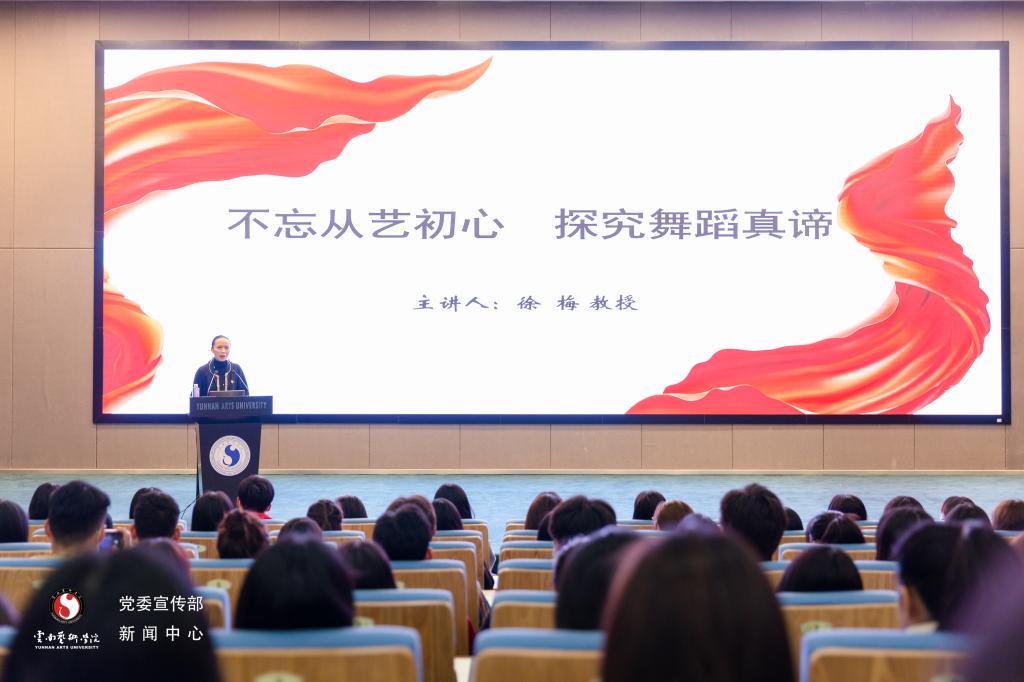 徐梅教授认为,探寻艺术真谛之路的初心即“本着扎根本土、为人民服务的初衷,以及传承民族文化的责任感和使命感,成为个人对事业的追求、并将其倾注于舞蹈教学、科研、创作及展演中。以舞蹈抒民族浩气,扬当代正声。”她以“不忘从艺初心 探究舞蹈真谛”为题,以分析七部经典舞蹈作品的创作过程、文化内涵为线索,以现场播放《灵·境》《又见花灯》《独龙情怀》《天路》《奋斗吧中华儿女》等经典作品视频片段为生动案例,结合著名舞蹈表演艺术家刀美兰、贾作光等前辈的从艺经历,教导学生们应在艺术创作的过程中将理性舞蹈技巧和感性舞蹈情感高度结合,在作品中舞出我人生,彰显艺术价值;舞出时代风采,坚持守正创新;舞出精神高度,引领社会风尚。
