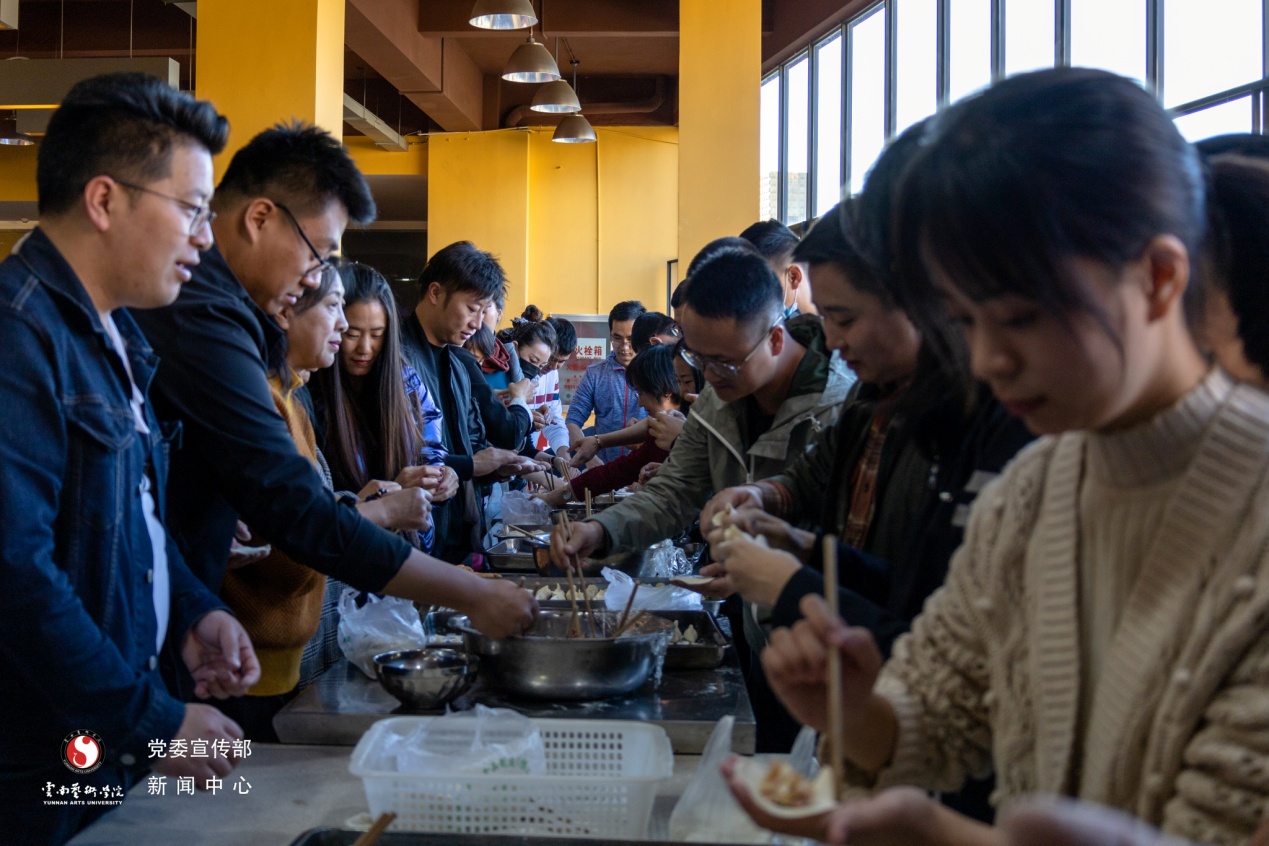 活动现场领导与新入职人员一边包饺子,一边亲切交谈,欢声笑语不断,活动现场处处洋溢着温暖与祥和的气氛,这不仅让新入职人员感受到了云艺大家庭的温暖,更让他们切身感受到了学校党委行政的亲切关怀。