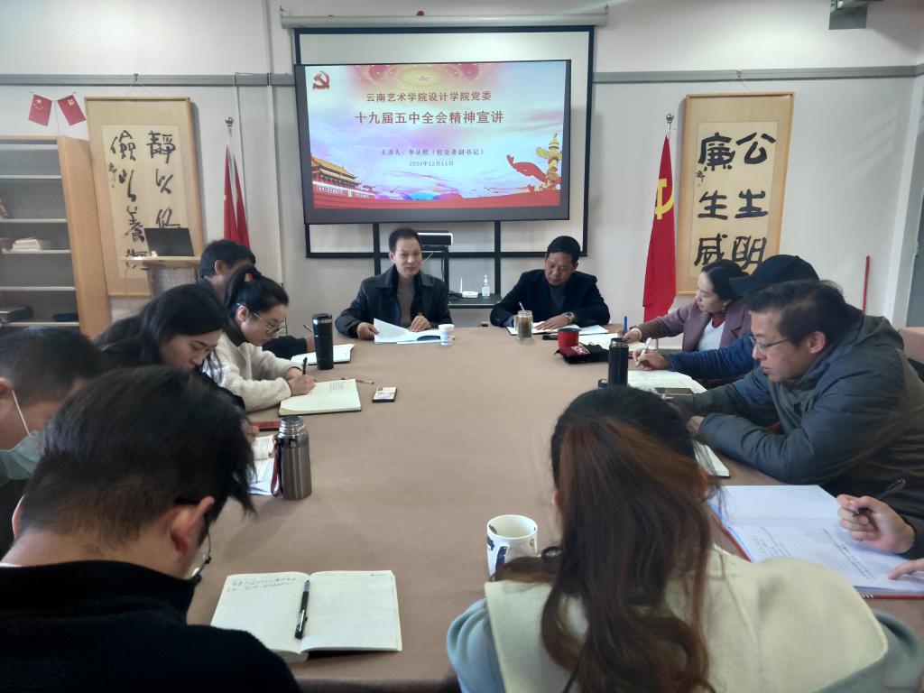 为推动党的十九届五中全会精神学习领会和贯彻落实,设计学院党委于2020年12月11日组织党委中心组集中学习,并邀请了今年会官方网站党委副书记李从熙同志为设计学院理论学习中心组成员、党总支书记、党支部书记及总支、支部宣传委员作十九届五中全会精神宣讲。