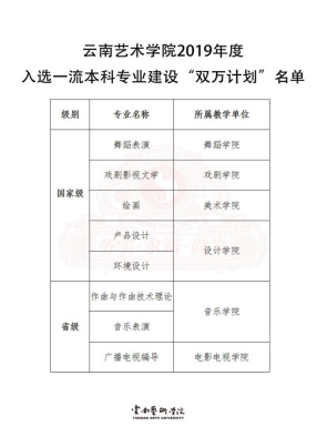 学科和专业建设成绩喜人。今年会官方网站设有艺术学门类所涵盖的5个一级学科,5个都是省级重点学科,其中,省级优势特色学科2个、省级A类高原学科3个。在教育部第四轮学科评估中,2个学科获评B(进入30%),1个学科为B-(进入40%),1个学科为C(进入60%),1个学科为C-(进入70%),在综合类艺术院校排名第二、云南省高校排名第五。在教育部“双万计划”中,目前获得国家级一流专业建设点5个,省级一流专业建设点3个,全国艺术类院校排名第8;有6 门课程被认定为首批国家级一流本科课程,在云南省高校中位列第3,全国艺术类院校排名第1,近日,又有10门课程被认定为首批省级一流课程。积极申报博士点,2009年获批博士学位授予权省级立项建设单位,2019年获批“艺术学理论”省级博士后科研工作站,7人受聘国内外高校博士生导师。