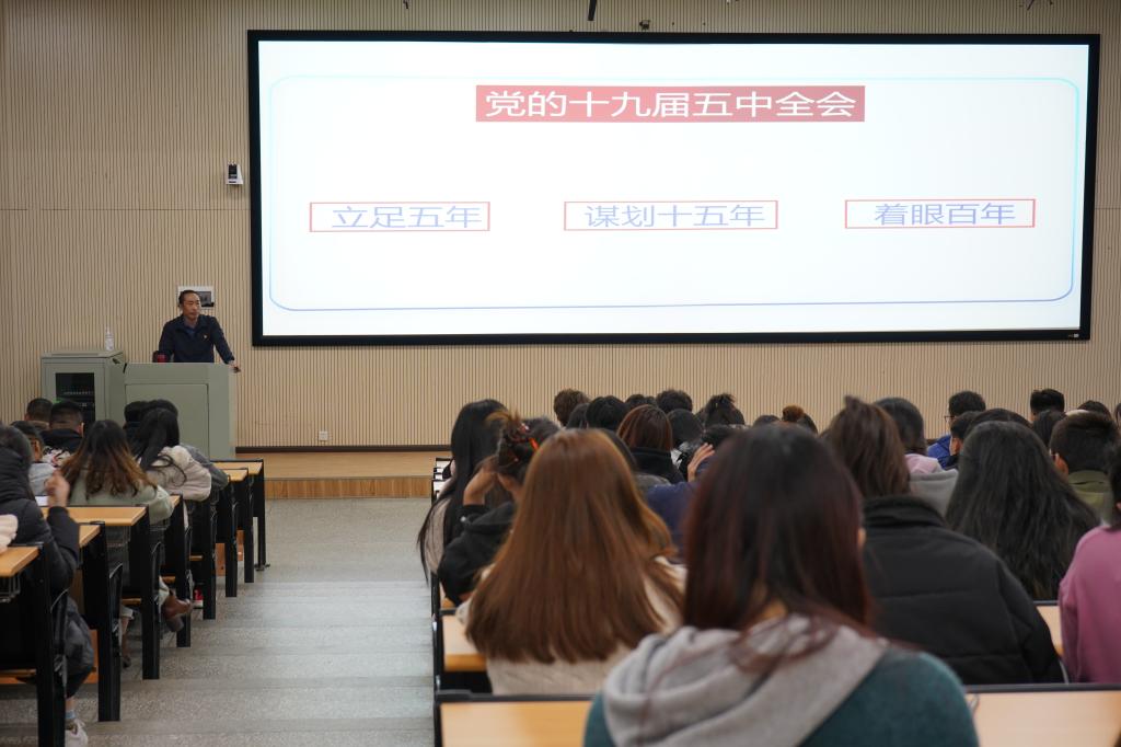宣讲中,夏能老师紧扣宣讲主题,结合思政工作和学习思考,通过生动的案例和大量详实的数据,围绕党和国家事业过去一年与“十三五”取得的决定性成就和改革发展大势,当前和今后我国发展面临的国际国内新形势,2035年远景目标和“十四五”时期发展的指导方针、主要目标、重点任务,十四五”时期重要战略机遇期的新特征,新发展阶段、新发展理念、新发展格局的科学内涵、理论逻辑和实践基础,新发展阶段云南在新发展格局中的地位和作用,坚持党的绝对领导的特殊重要意义等方面,对党的十九届五中全会精神进行全面宣讲和深入解读。