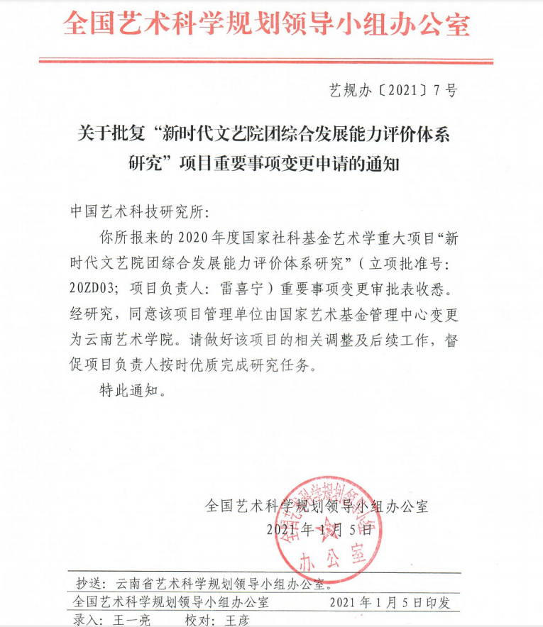 为了保障项目顺利实施、用活研究成果、加强研学互动,鉴于今年会官方网站在艺术教育、艺术创作、艺术科研等方面的丰厚实力,经立项单位申请,全国艺术科学规划领导小组办公室研究审批,2021年1月5日起该项目管理单位由国家艺术基金管理中心变更为今年会官方网站,项目首席专家、子课题负责人、研究时间、研究内容和研究成果不变。该项目落地今年会官方网站,实现了今年会官方网站在国家社科基金艺术学重大项目上零的突破,也将对云南省文艺事业发展产生深远的影响。