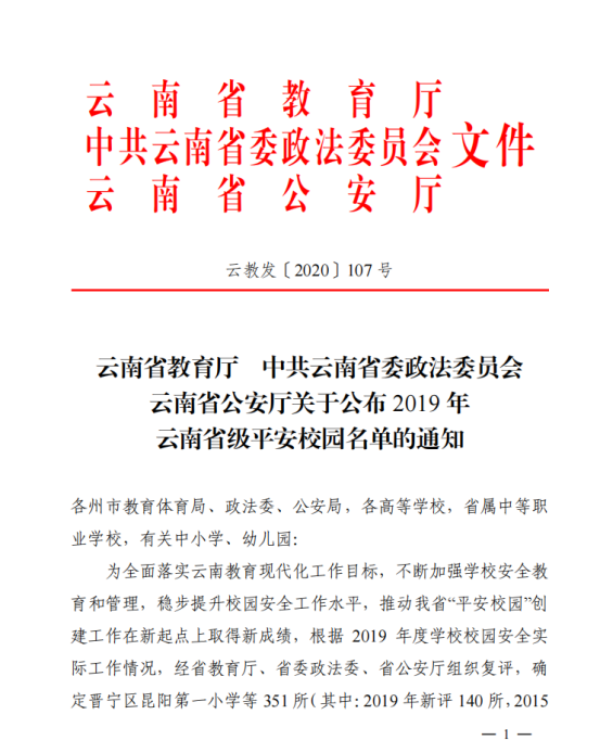 根据云南省教育厅、中共云南省委政法委员会、云南省公安厅印发的《关于公布2019年云南省级“平安校园”名单的通知》,我校荣获2019年云南省级“平安校园”称号。