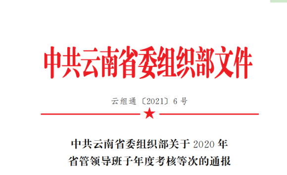根据《中共云南省委组织部关于2020年省管领导班子年度考核等次的通报》结果,我校被评为“优秀”等次。