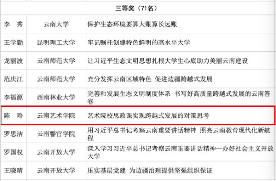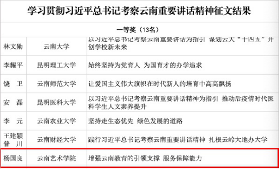 中共云南省委教育工委开展了学习贯彻习近平总书记考察云南重要讲话精神征文活动。我校党委副书记杨国良的征文《增强云南教育的引领支撑 服务保障能力》荣获一等奖,马克思主义学院教师崔琳的征文《以习近平总书记考察云南重要讲话精神 引领高校职能建设》荣获二等奖,马克思主义学院教师陈玲的征文《艺术院校思政课实现跨越式发展的对策思考》荣获三等奖。