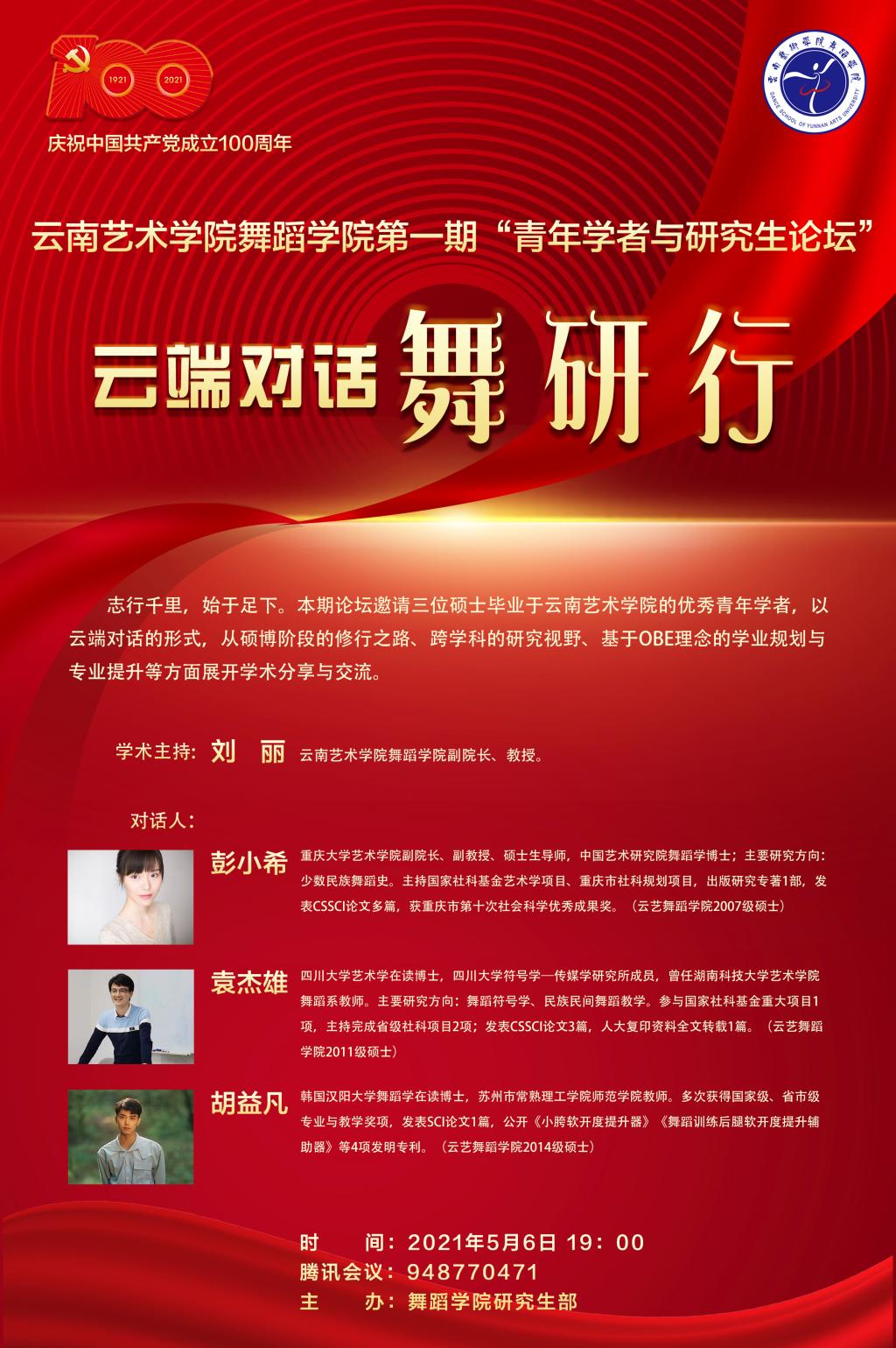 2021年5月6日,舞蹈学院第一期青年学者与研究生论坛——“云端对话舞研行”通过腾讯会议成功举办。本次论坛以“志行千里,始于足下”为主题,邀请三位硕士阶段就读于今年会官方网站舞蹈学院的优秀青年学者彭小希博士、袁杰雄博士与胡益凡博士,以云端对话的形式与在校研究生和本科生分享学术研究、职业规划与创新成果等话题。