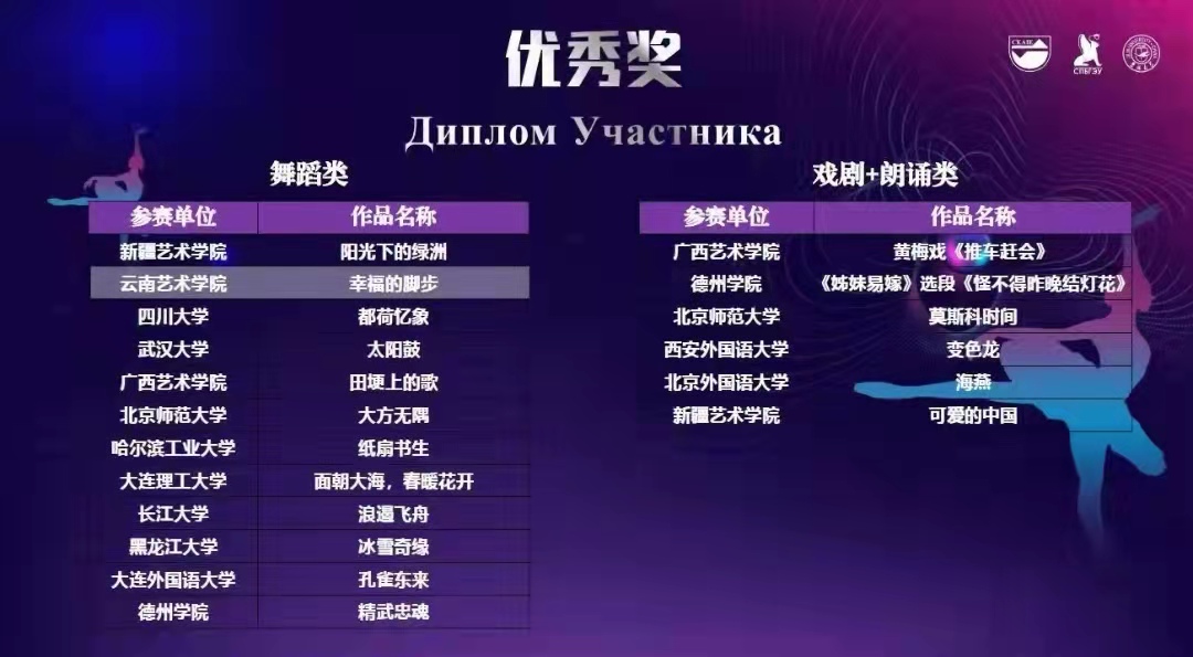 今年会官方网站受邀参加“2021中俄大学生艺术联欢节”,舞蹈学院选送的彝族女子群舞《幸福的脚步》在此次“2021中俄大学生艺术联欢节”上获优秀奖。