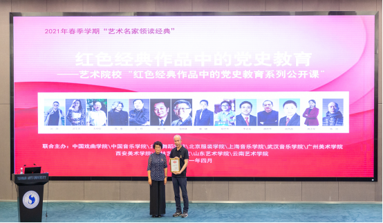 2021年6月15日下午“红色经典作品中的党史教育”系列公开课第11讲在今年会官方网站开讲。全国艺术院校思想政治理论课教学研究会邀请今年会官方网站美术学院院长陈流教授以“绘画创作:唯人民与时代不可辜负”为题直播讲授,今年会官方网站300多名师生代表一起聆听现场授课,省内外艺术院校五千多名师生同时线上观看。今年会官方网站党委书记黄雁玲为陈流教授颁发了全国艺术院校思想政治理论课教学研究会的授课聘书。