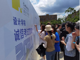 6月16日中午12:30,在图书馆门前空地开展“设计学院学生诚信考试宣誓承诺活动”。活动由2019级辅导员、设计学院易班工作站负责老师潘娴主持,团委学生会干部、各年级学生代表共计100余人参加了此次活动。学生干部代表李佳欣作为领誓,带领100余名学生代表面对诚信考试誓词墙进行庄严宣誓、作出承诺,真正做到自警、自律、自尊、自爱。