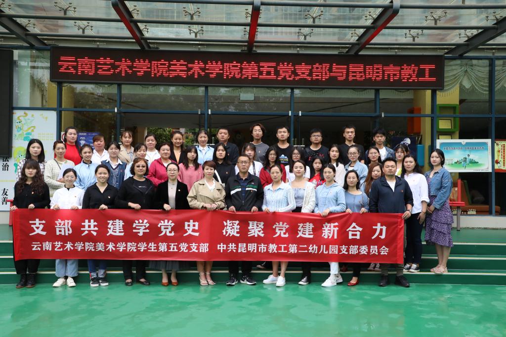 为扎实开展“庆七一,献礼建党百年”主题党日活动,树立正确的党史观,教育引导全体党员学好百年党史,传承红色基因,凝聚奋进力量,2021年6月22日上午,美术学院党委副书记何君、组织委员李爱梅、学生第五支部书记杨旭带领21名学生党员赴昆明市教工第二幼儿园进行支部共建。昆明市教工第二幼儿园党支部书记、园长李玉梅,组织委员邓敏,纪检委员马薇,青年委员赵娅婕,党务干部李柯瑶和部分教师党员参与了共建活动。