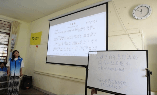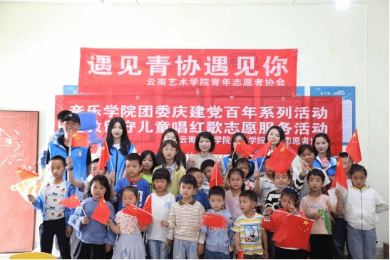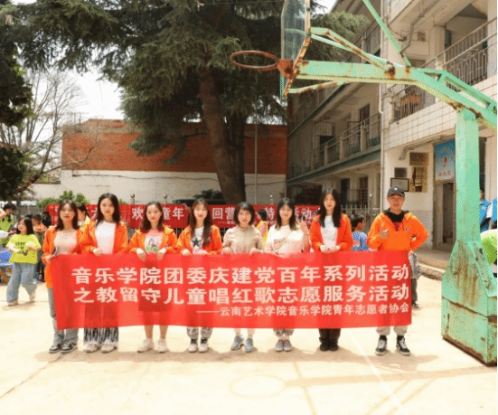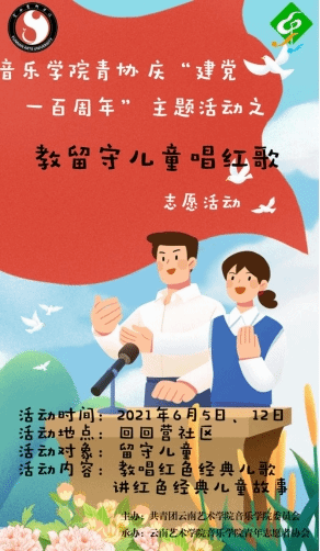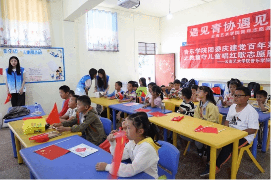 2021年6月5日、6月12日,今年会官方网站音乐学院团委、青年志愿者协会赴昆明市呈贡区回回营社区儿童服务站与留守儿童一起开展“宣讲红色故事、教唱红色歌曲”活动。培养共青团员、少先队员、儿童的爱国爱党精神,丰富社区文化生活。