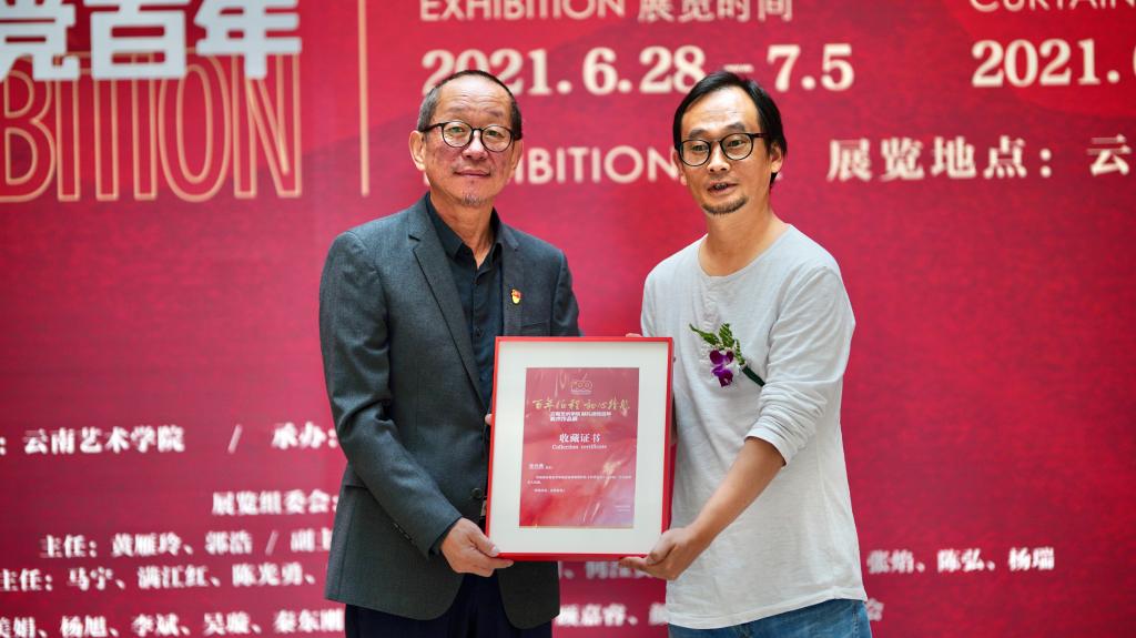 校党委副书记、院长郭浩为美术学院版画系主任陈光勇颁发捐赠收藏证书。并宣布展览开幕。