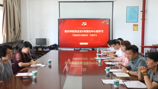 6月24日下午,音乐学院召开理论中心组学习会议,专题传达学习学校师德师风工作会议精神和《新时代高校教师职业行为十项准则》。校党委书记黄雁玲同志、院办公室(党委巡察办)副主任姜南同志列席学习会议并进行指导,音乐学院党政班子成员、党总支委员参加学习会议,音乐学院党总支书记纳海同志主持中心组学习会议。