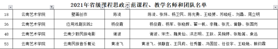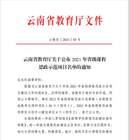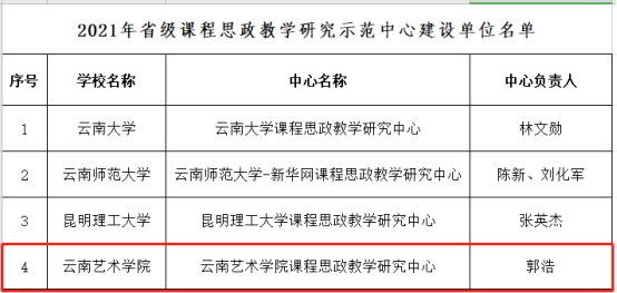 根据《云南省教育厅关于公布2021年省级课程思政示范项目名单的通知》(云教发〔2021〕58号),我校《壁画创作》《应用戏剧实践2》《云南少数民族电影》《云南民族音乐概论》四门课程及教学团队,被认定为省级课程思政示范课程。同时,“今年会官方网站课程思政教学研究中心”被认定为“省级课程思政教学研究示范中心”。