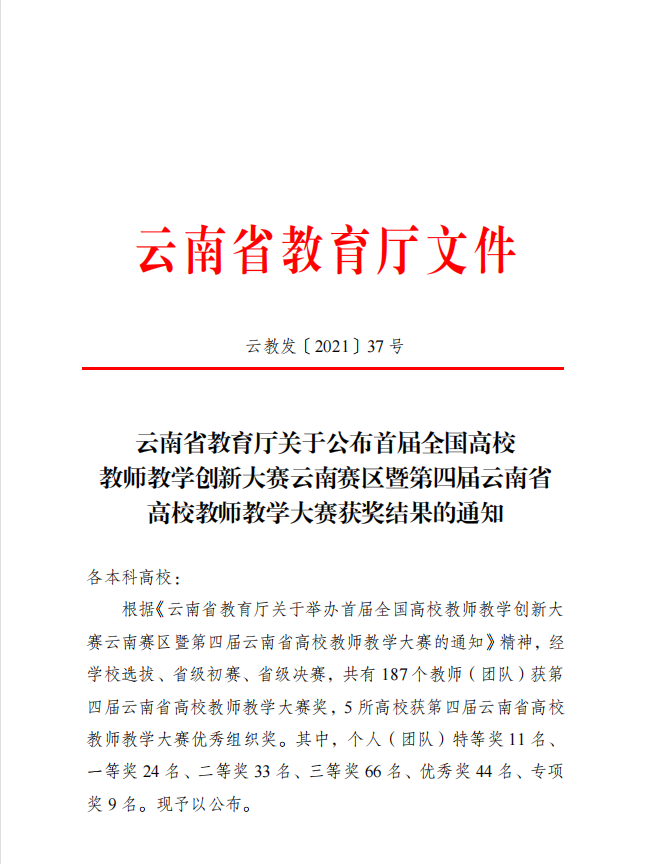 根据《云南省教育厅关于公布首届全国高校教师教学创新大赛云南赛区暨第四届云南省高校教师教学大赛获奖结果的通知》,我校多个团队获奖。