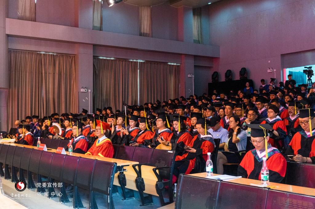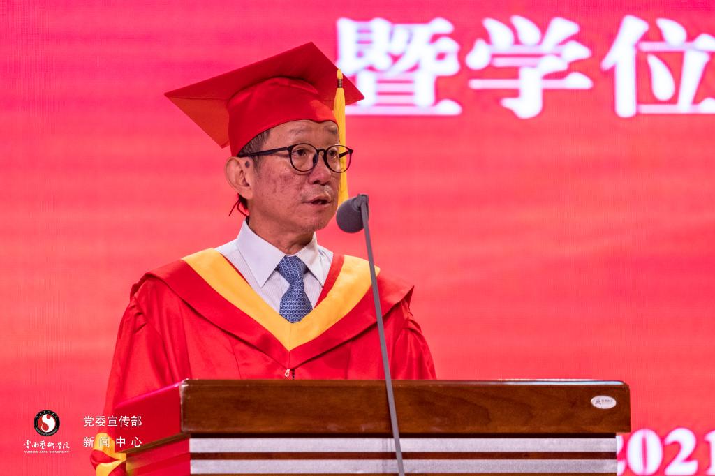 校党委副书记、院长、学校学位评定委员会主席郭浩致辞。致辞中提到以下两点:第一,一定要懂得科学视野与社会实践的平衡;第二,一定要把握坚守理想与抵达成功的秘诀;最后他希望云艺毕业学子能够成为一个个有胸怀、有担当、有修养、有情怀的新时代青年,希望他们能够展翅高飞、鹏程万里,早日取得更大的成绩,早日成为国家的栋梁之才。
