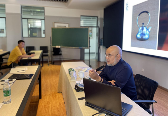 赖庆国老师以《器·艺之道“于用得趣-于趣悦用》为主题,讲述了个旧锡器、锡工艺的发展历史,并通过实际案例分享了他在非遗传承与保护中的经验。赖庆国老师在讲座中提到:“容心为家、容物为器,是为艺器之道。”不管哪种工艺门类,大多都是以器物为载体,工艺创作者应该学会用优秀的作品来表达自己的想法和构思。赖庆国老师同时还提出:“在新时代的发展潮流中,许多非遗有势而无市,有市而无价,在此情况下,我们的非遗传承就更需要做到正本清源,非遗创作也需要做到于用得趣,于趣悦用。”他认为非遗在当代社会的传承应具有情感、生命力和文化内涵。非遗传承人在实践过程中,要学会去营造器物的“趣味性”,让受众对产品产生兴趣,从而达到消费和传播的目的。
