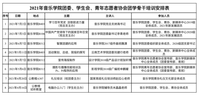 通过此次系列培训讲座既教育引导音乐学院团学骨干、团员青年了解党的光辉历史、感悟党的初心使命、传承党的红色基因,厚植爱党、爱国、爱社会主义的情感,更加自觉地以习近平新时代中国特色社会主义思想武装头脑,进一步增强“四个意识”、坚定“四个自信”、做到“两个维护”,坚定不移跟党走中国特色社会主义道路,为全面建设社会主义现代化国家、实现中华民族伟大复兴中国梦贡献青春力量,又提高了团学骨干的工作能力和业务水平,进而提高各部门的工作效率,更好的服务音乐学院师生,以优异的成绩向建党100周年献礼。
