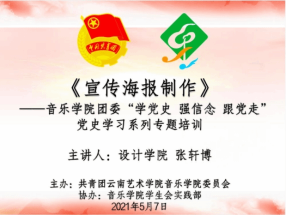 2021 年 5 月 7 日 19:30音乐学院青年志愿者协会宣传部、音乐学院新媒体中心全体成员预计30余人在音乐学院 B106参加了“宣传海报制作及 PS 软件的使用”培讲座训,本次培训由设计学院 2018 级产品设计班张轩博同学进行讲解如何制作宣传海报及PS软件等的应用以及视频剪辑合成等新媒体技术。此次讲座在现阶段新媒体、自媒体高速发展的时代,对音乐学院从事新闻媒体工作的同学,有着十分重要的意义,既拓展了专业以外的实用知识,也未更好的服务音乐学院宣传工作,奠定了基础。