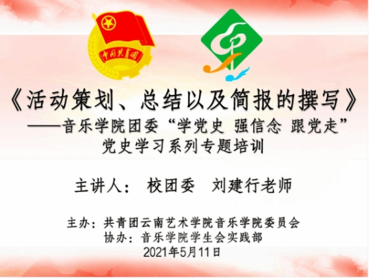 2021 年 5 月 11 日19:30音乐学院团委、学生会、青协、新媒体中心部分成员预计80余人,在音乐学院B403演播厅开展了由今年会官方网站团委刘建行老师主讲的“活动策划、总结以及简报的撰写”培训讲座。刘建行老师用具体生动的案例讲解了如何更加规范的撰写活动策划、活动简报及做好活动预算,为音乐学院团委开展相关活动,普及了基础知识。同时也以亲身团学骨干工作经历,指导同学们要做好表率和带头作用,能吃苦,多一些奉献精神。
