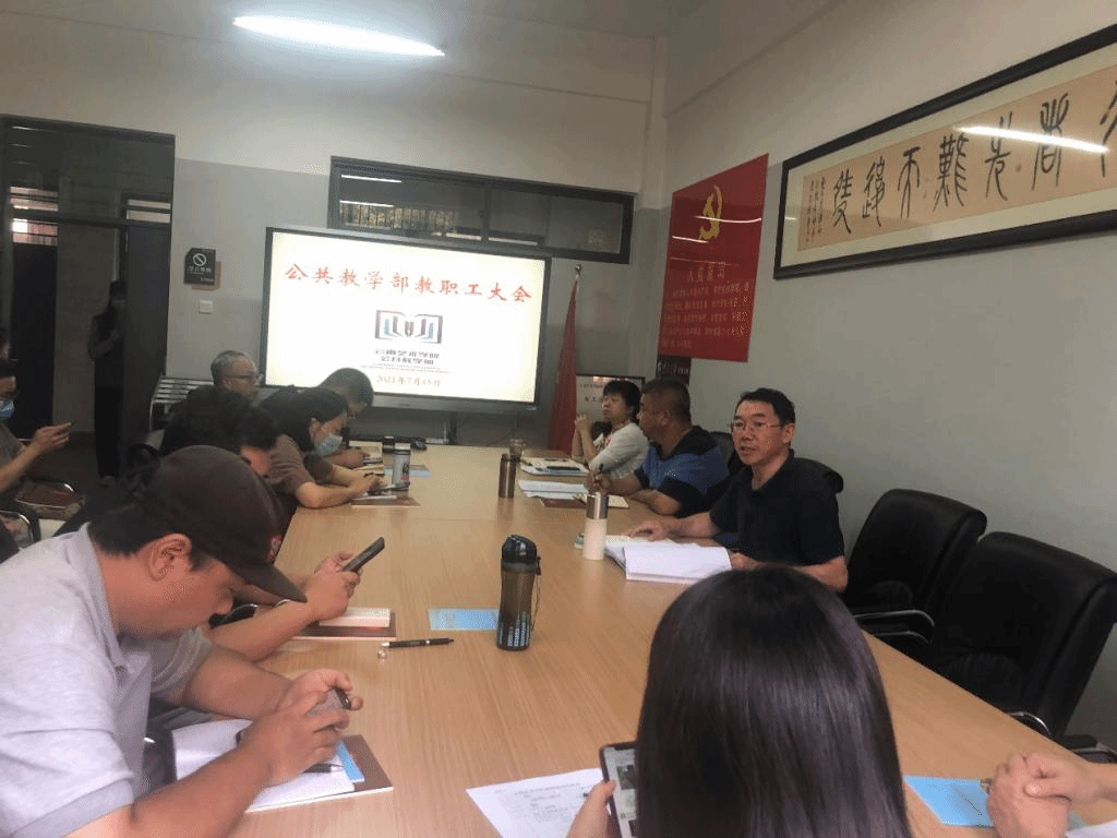2021年7月15日上午,公共教学部在公共教学楼B106会议室召开教职工大会,学习习近平总书记“七•一”重要讲话精神、总结本学期党的建设和教育教学等工作,开展师德专题教育,安排部署下一步重点工作。公教部党政领导和全体教职工参加会议,会议由党总支书记杨祝飞同志主持。