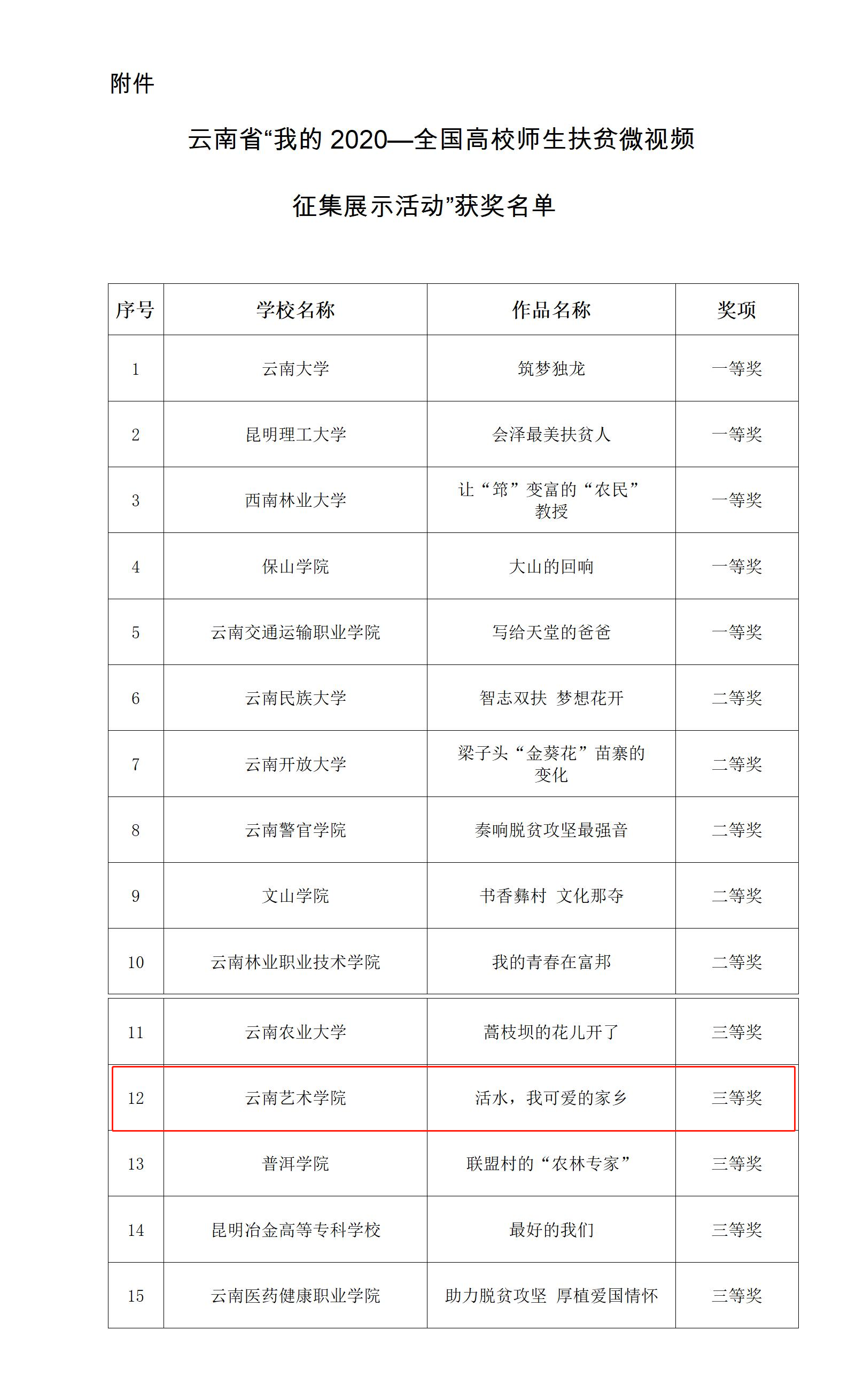 根据《中共云南省委教育工委办公室关于组织开展“我的2020-全国高校师生扶贫微视频征集展示活动”的通知》精神,通过层层推荐,专家评审,今年会官方网站《活水,我可爱的家乡》作品荣获三等奖。
