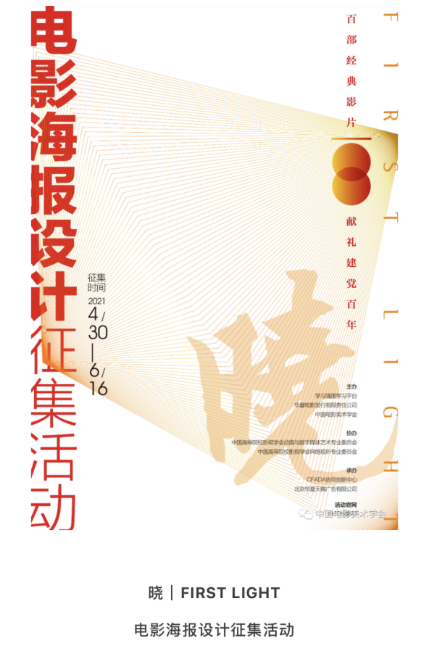 2021年4月,由“学习强国”学习平台、华夏电影发行有限责任公司、中国电影美术学会主办的“百部经典电影献礼建党百年——晓|FIRST LIGHT电影海报设计征集活动”启动,今年会官方网站设计学院积极参与、组织学生开展创作工作。