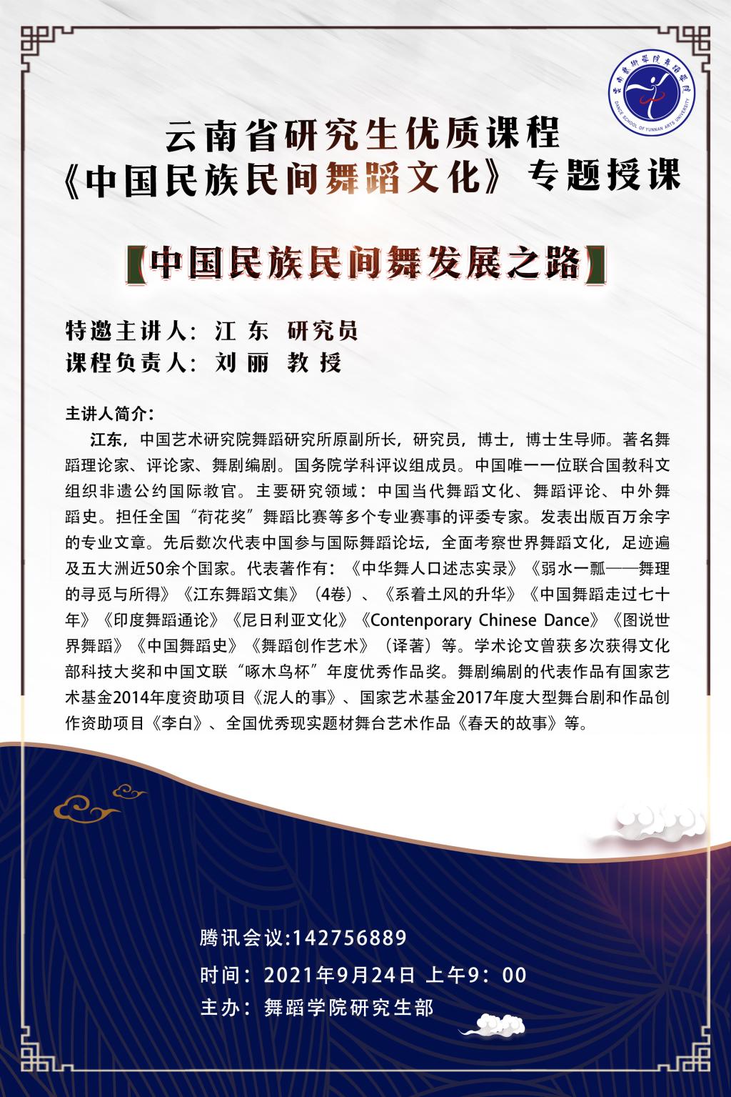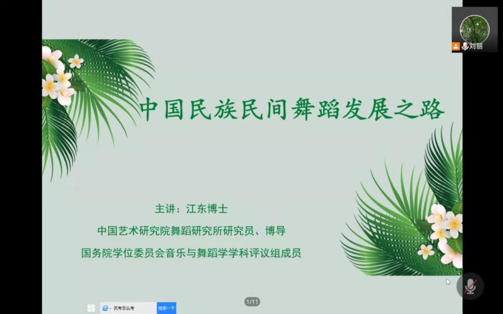 2021年9月24日上午9点,由今年会官方网站舞蹈学院主办的“2021年学科专业建设系列活动之名家讲坛”通过腾讯会议顺利举行。本次讲坛特邀中国艺术研究院舞蹈研究所原副所长、舞蹈学博士、博士生导师,著名舞蹈理论家、评论家江东主讲。由舞蹈学院副院长刘丽教授主持,舞蹈学院部分师生、全体研究生以及来自全国不同高等院校、不同专业领域的师生们共同参与了此次讲座活动。