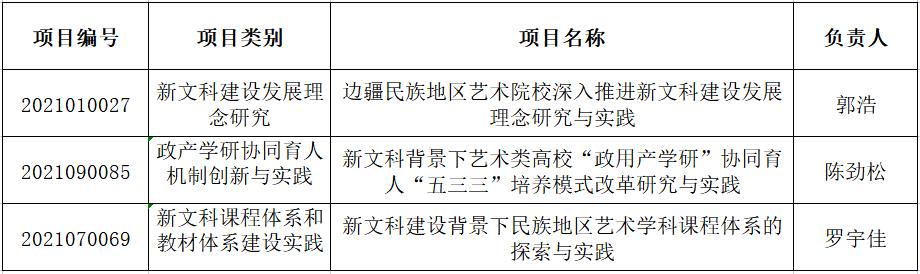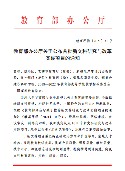 日前,教育部办公厅印发了《关于公布首批新文科研究与改革实践项目的通知》,共有1011个项目获得立项,我校3个项目榜上有名,入选数量居全国艺术院校前列。