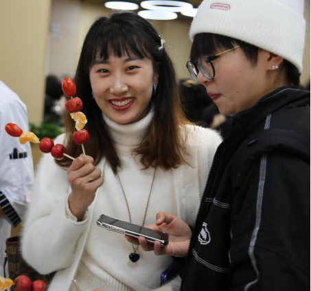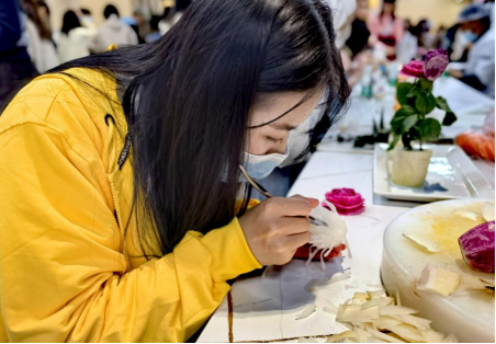 本次校园饮食文化节活动形式丰富多彩,设置了展示区、品尝区、互动区、舞台表演区。展示区的菜品展示以中国八大菜系之一的“苏州本帮菜”为主,云南特色小吃为辅。负责讲解的同学从中选出了10道知名菜品为大家一一讲述其中的典故。同时,展示区陈列出40余种精致的面塑和雕塑作品,栩栩如生、向师生们展示了饮食之美。在互动区除了可以参与雕花、捏面塑、做糖葫芦外,还可以学习和面擀皮拌馅儿包饺子,除了感受参与劳动的快乐,还可以体验和好朋友们一起分享劳动果实的喜悦。品尝区提供了云南,苏州,贵州等13种地方特色小吃供师生免费品尝,让师生们足不出户感受不同地域的饮食文化。舞台表演区有音乐学院和舞蹈学院的同学们带来精彩的歌舞表演,在场的同学们积极踊跃参加游戏环节赢取游戏小礼品。除此之外,经过严格消杀和防护,还可在工作人员的引导下进入后厨参观,见证食品安全生产流程、环节。