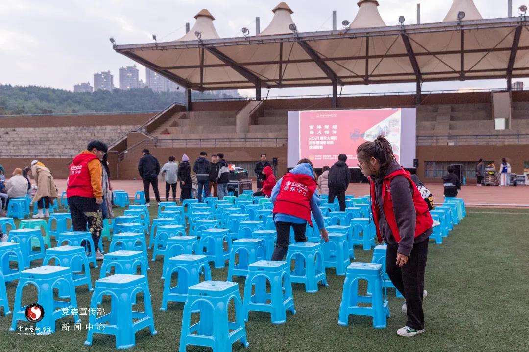 为保证活动顺利举办,新闻中心的“小红人”们在活动开始前就早早地到达体育场搭幕布、搬凳子,悉心布置现场,用认真负责的工作态度走好今天的长征路。