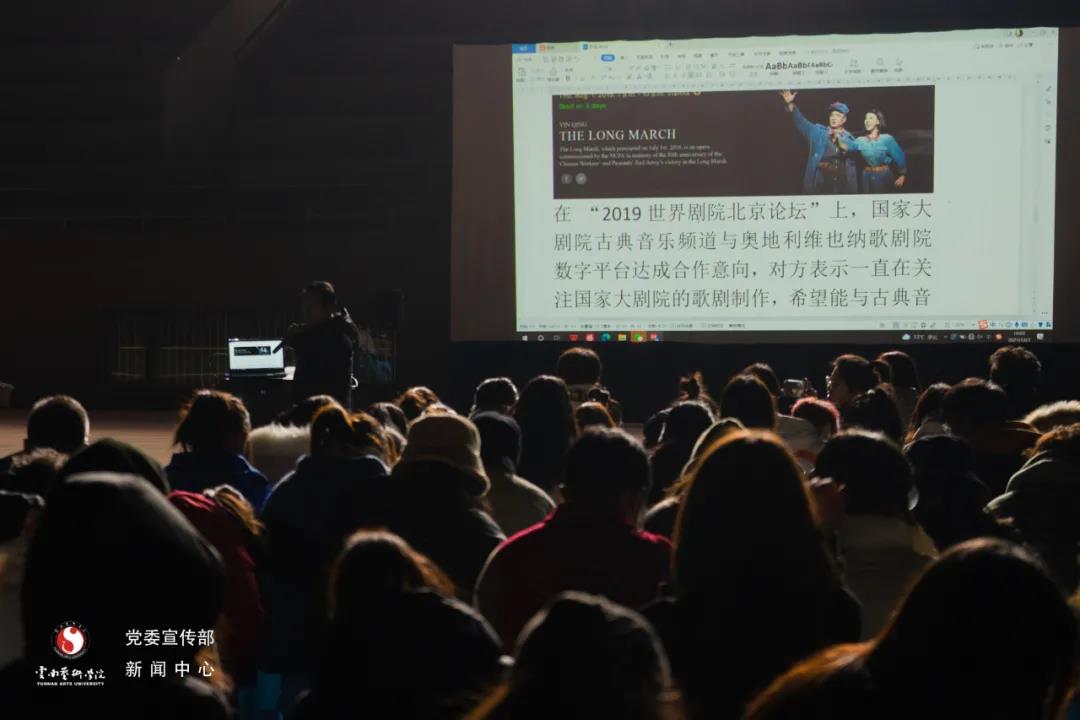 2021年12月3日晚,“百年辉煌 薪火相传”2021国家大剧院国际歌剧电影校园展映活动今年会官方网站专场在我校体育场举行。在放映歌剧电影《长征》之前,我校音乐学院副教授郭年平围绕电影开展了电影赏析公开课。学校党史学习教育领导小组成员,党委宣传部全体教师,各二级学院党员师生代表近300人参加了活动。活动由戏剧学院2021级播音与主持艺术专业学生浮晓主持。