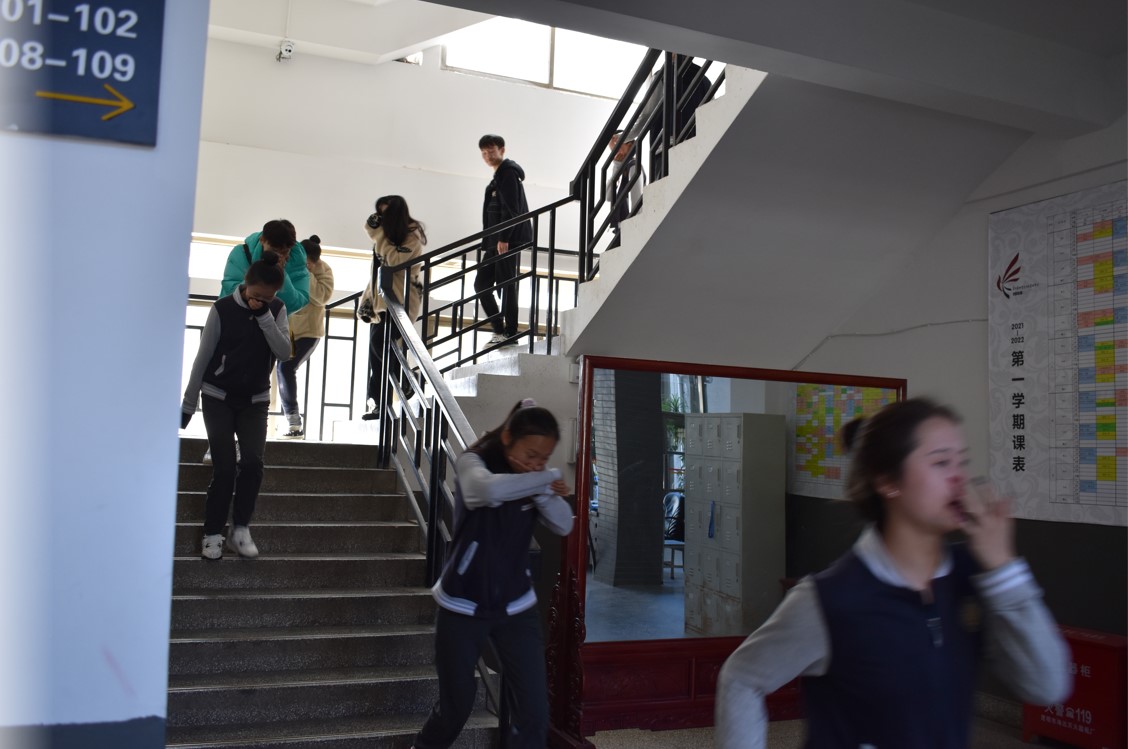 11:45分,全体学生到达操场后,各班主任开始清点人数,并将集合人数报告给学保科,学保科杨富老师向农布七林校长汇报情况。随着农布七林校长“演练开始”一声令下,全体学生迅速回到教室待命,演练正式拉开帷幕。12:18分,预警哨声响起,各班主任立即告知学生“发生火灾了,大家不要慌”,马上指挥学生蹲在课桌旁,用手或其他物品护住头部紧急避险,用湿布或衣物捂住口鼻,带领本班队伍弯腰低头,分别从教室前后门成两路纵队进行疏散。各楼层人员指引学生迅速有序地从楼道两侧安全通道紧急撤离至操场指定位置站好,完成人数清点和报告工作。经核实,本次应撤离人数与实际人数相符。整个逃生演练过程行动统一、秩序井然,没有发生拥挤、踩踏和碰伤学生的现象,达到了预期效果。