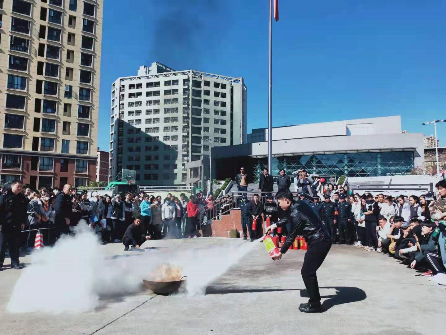 12:34分,在学校篮球场外围空地,食堂、宿管、校卫队、新生班主任、学生治安大队人员轮流进行油盆灭火实战演练。通过操作示范和现场观看,让我校师生对灭火器的正确使用和作用发挥以及如何在突发情况下以最快捷、最有效的方式扑灭初起火灾有了更深更全认知,既检验了应急救援能力,又科普了消防器材使用,取得了良好效果。