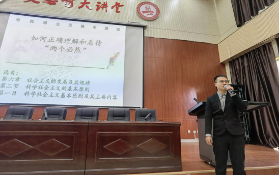 宾岩老师向在场的老师、同学们现场展示了《如何正确理解和看待“两个必然”》节段,重点阐述了“两个必然”的科学内涵及其重要地位、“两个必然”提出的科学依据、“两个必然”实现的条件保障,进一步增强了广大青年大学生朋友对“共产主义必然胜利”信仰信念信心。