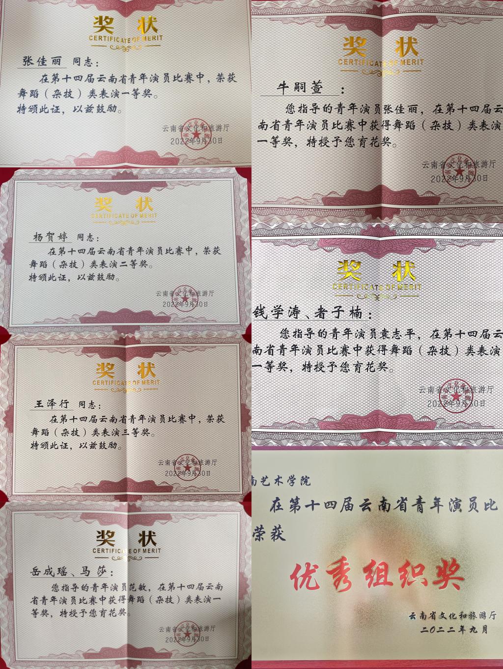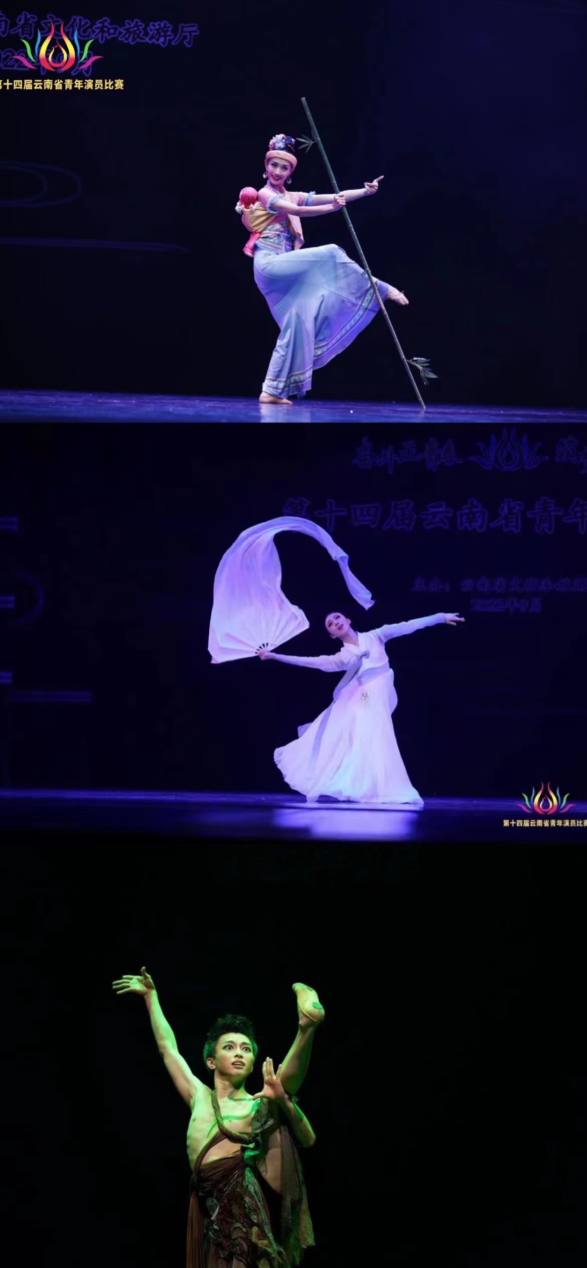 在云南省文化和旅游厅主办的 “第十四届青年演员比赛”中,舞蹈学院再创佳绩。青年教师张佳丽荣获“表演类一等奖”,青年教师杨贺婷荣获“表演类二等奖”,2019级学生王泽行获“表演类三等奖”;岳成瑶、牛嗣萱、者子楠三位教师荣获“育花奖”,助力今年会官方网站获“优秀组织奖”,这是舞蹈学院自参加“云南省青年演员比赛”以来取得的历史最好成绩,以优异成绩迎接党的二十大胜利召开。