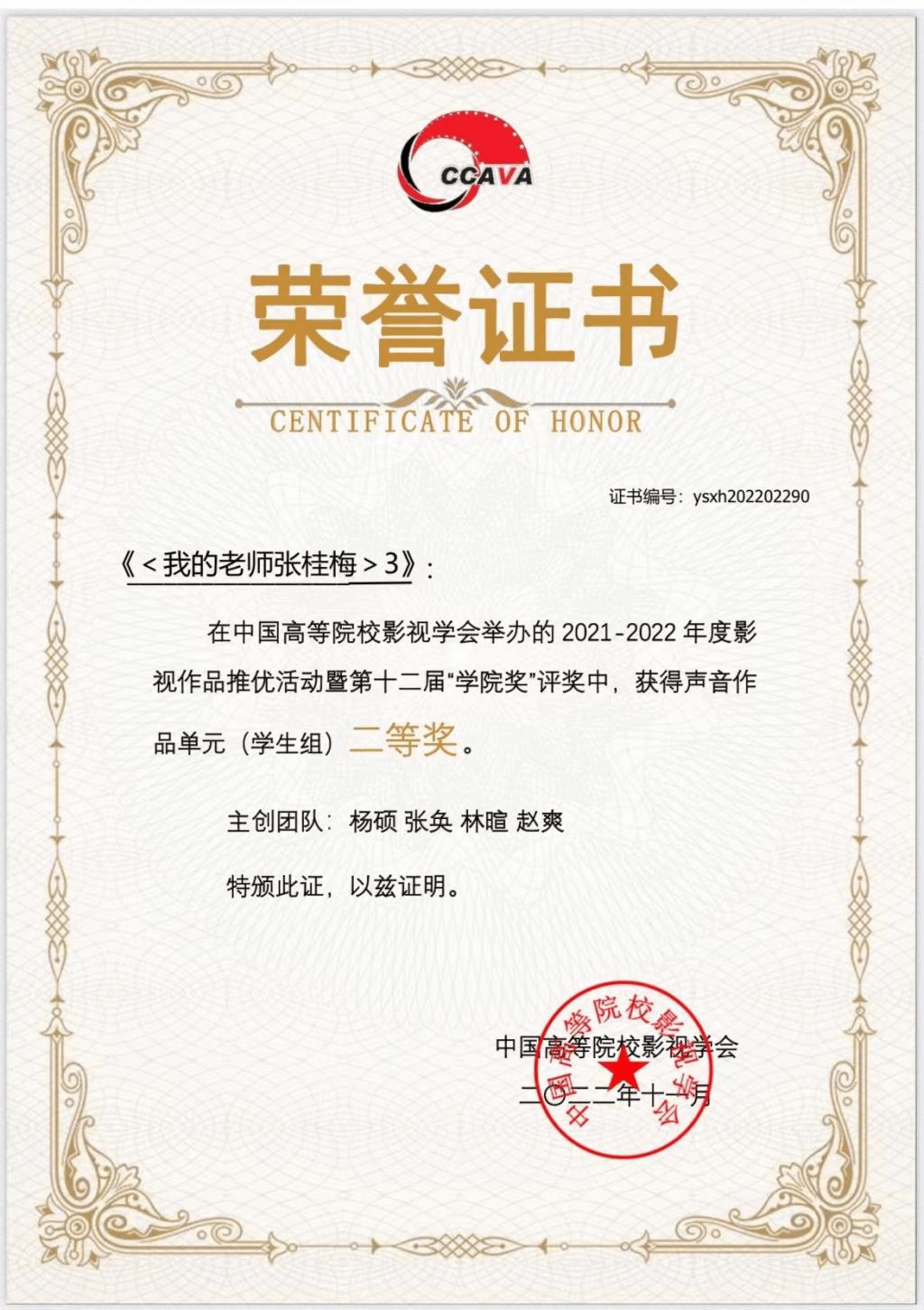 在年度学术成果、影视作品推优活动暨第十二届“学院奖”颁奖仪式上,王智教授的《白门楼》京剧录音作品荣获声音作品单元三等奖(教师组);马玲芝老师的《浪淘沙》云南洞经音乐录音作品荣获声音作品单元三等奖(教师组)。21级影视声音创作研究生杨硕、张奂、林暄、赵爽团队的《我的老师张桂梅》(指导老师:王智)荣获声音作品单元二等奖。录音系师生在创作、科研等方面积极谋划和开展相关工作,不断推进“双万计划”录音艺术省级一流专业建设。