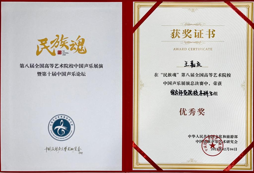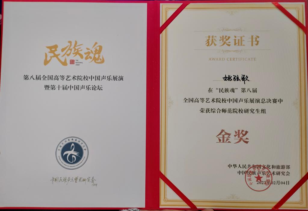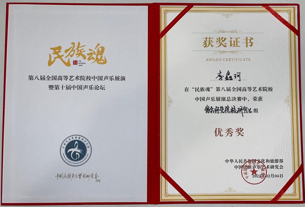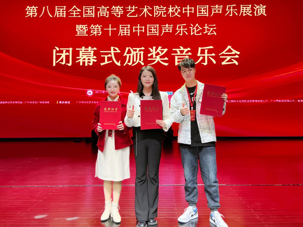 “第八届全国高等艺术院校中国声乐展演”总决赛于2023年2月4日圆满落幕,来自80余所高等艺术院校、综合类师范大学的优秀选手参加了本次总决赛。经过激烈角逐,我校音乐学院林林教授指导的2021级硕士研究生姚弦歌荣获综合师范院校研究生组金奖;陈红玲教授指导的2021级本科生王嘉庆荣获综合师范院校本科生组优秀奖;舒丽萍副教授指导的2022级硕士研究生李鑫珂荣获综合师范院校研究生组优秀奖。