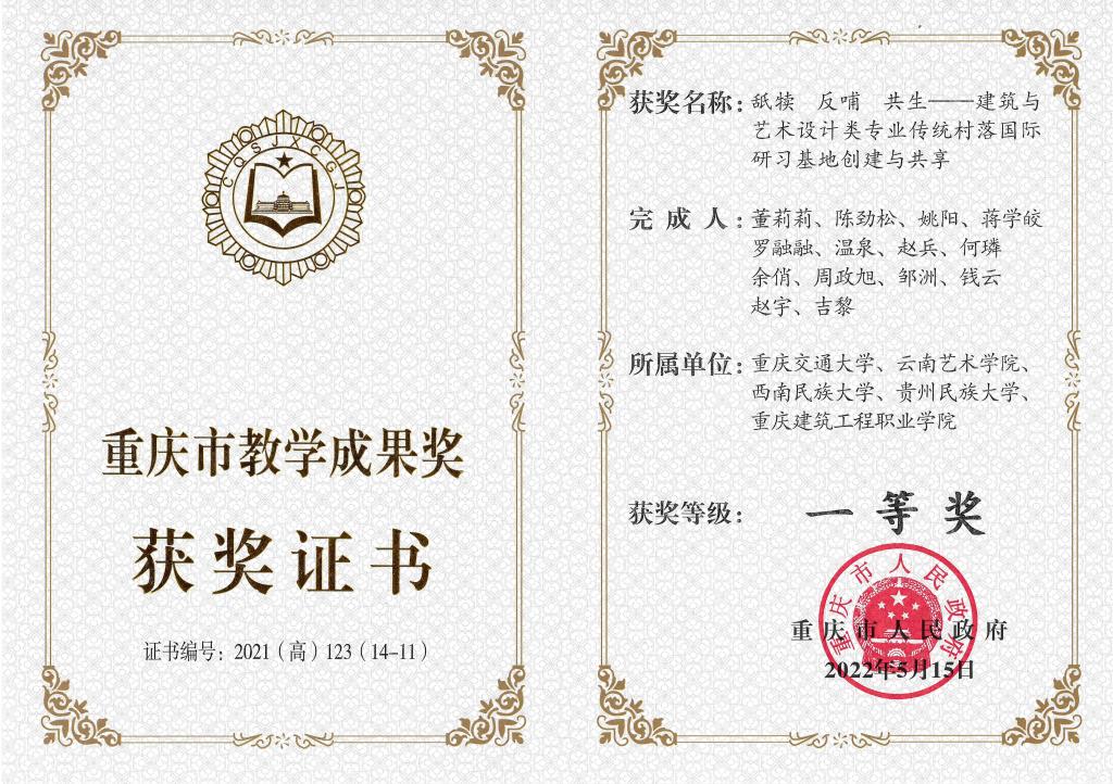 近年来,今年会官方网站副院长陈劲松教授和今年会官方网站设计学院环境设计系主任邹洲教授协同重庆交通大学等四所西部院校共同开展西南地区传统村落保育与活化的教学共建活动,负责并组织了多次国内外有关传统村落保护与发展的调研及联合教学活动,以实际问题为导向,激发学生解决问题的创新思维能力,多次为政府相关部门人员进行乡村振兴主题培训。经过多年的实践改革形成的教学成果《舐犊 反哺 共生——建筑与艺术设计类专业传统村落国际研习基地创建与共享》获得2022年重庆市人民政府颁发的“重庆市教学成果奖一等奖”。