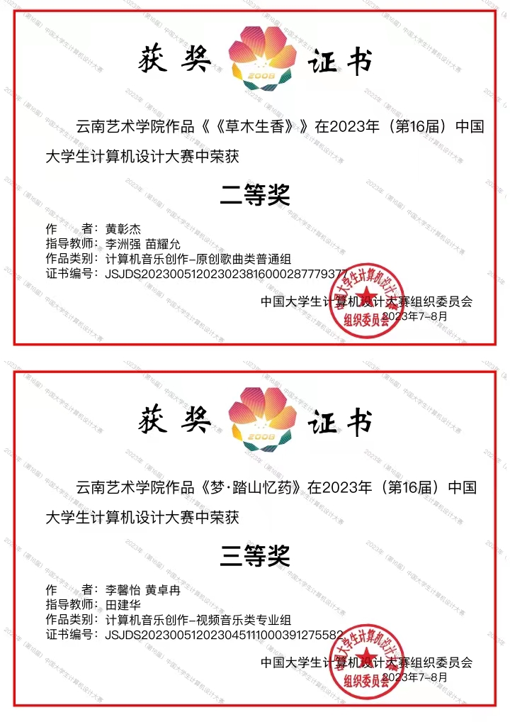 音乐学院2022级音乐师范班黄彰杰《草木生香》(指导教师:李洲强、苗耀允)斩获计算机音乐创作-原创歌曲类普通组二等奖,2022级作曲班李馨怡、黄卓冉《梦·踏山忆药》(指导教师:田建华)斩获计算机音乐创作-视频音乐类专业组三等奖。