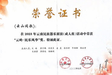 在云南省文化馆与云南省音乐家协会主办的“2023年云南民族器乐展演”中,音乐学院国乐系和作曲系教师尹毅、郭乐、高弘扬和赵云龙共同指导的“云上弦歌民族室内乐团”参与比赛并斩获佳绩比赛中,演奏高弘扬作曲的《云山阙歌》《云旎》和邹航编曲、梁聆聆改编的《加林赛》分别荣获成人组“云岭·民乐风华”(一等奖)、“云岭·民乐风雅”(三等奖)和“云岭·民乐风韵”(二等奖)。